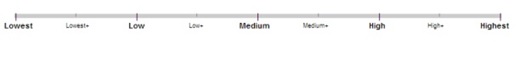 You may also use the in-between ratings of Lowest+, Low+, Medium+, and High+. Please interpret the “+” as “+ ½,” meaning that the Lowest+ rating is halfway between Lowest and Low, Low+ is halfway between Low and Medium, etc.